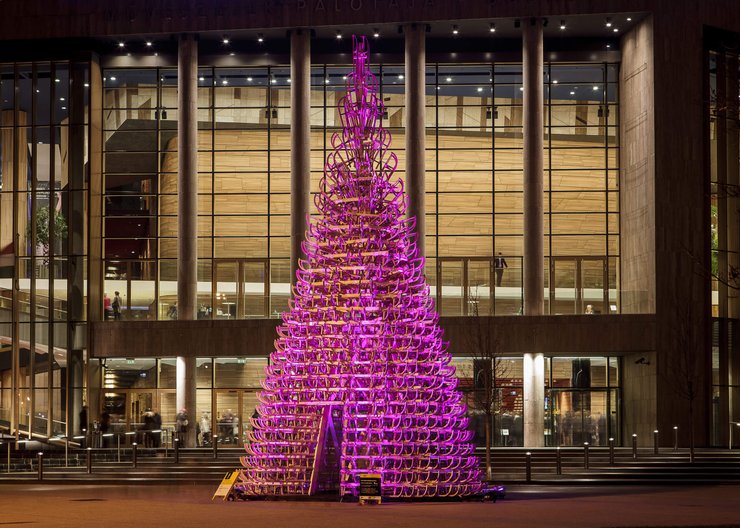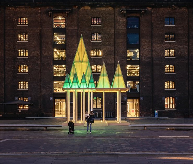На лондонском вокзале Кингс Кросс регулярно выставляют необычные рождественские деревья, а в этом году их три — в разных местах вокруг вокзала. К примеру, на площади Гренэри установлено не просто дерево, а инсталляция, имитирующая зимний лес. Автором проекта Electric Nemeton стал лондонский дизайнер Сэм Джейкобс, который вдохновился легендами о неметонах — священных лесах друидов. С другой стороны дизайнер хотел создать безопасное открытое место для празднования в эпоху эпидемии, чтобы люди чувствовали дух праздника и в то же время могли соблюдать дистанцию. Для этого дизайнер создал множество стальных колонн, на них поместил платформу, а на нее — светящиеся пирамиды, призванные воплощать кроны хвойных деревьев. В темноте этот своеобразный лес особенно красив, поскольку цвета сменяют друг друга с зеленого на желтый с вкраплениями оранжевого и красного.