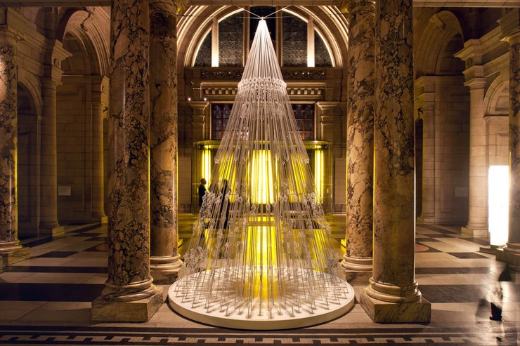 Коллекция лондонского Музея Виктории и Альберта охватывает разнообразные декоративные искусства. Поэтому и в дизайне праздничных елок музей регулярно подчеркивает идею ремесел и рукотворных чудес. К примеру, в 2011 году музей пригласил создать "дерево" датский дуэт дизайнеров Studio Roso, которые вдохновились традиционной техникой плетения кружев на коклюшках. Дизайнеры Софи Нильсен и Рольф Кнудсен взяли 5,3 км шнура, разрезали его на 1,5 тыс. отрезков и вручную вплели в них ажурные фрагменты, напоминающие игрушки. А затем натянули эти шнуры на конический каркас высотой 4 м. В итоге получилась изящная и праздничная инсталляция. "Геометрические украшения шнуров напоминают одновременно традиционный рождественский декор и кристаллическую структуру снежинок и сосулек", — так объясняли дизайнеры свою идею. Над этим своеобразным плетением Нильсен и Кнудсен работали три недели. В то же время дизайнеры подчеркивают, что для создания праздничного объекта необязательно нужны дорогие материалы и из самых обиходных можно сделать нечто оригинальное.