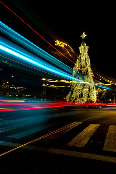Собственно, на простоте формы Серхио Себастьян и построил свой проект, поскольку "ветки" его елки-инсталляции составляют треугольники с прямыми прутьями. Однако они были установлены на 25-метровом каркасе так, чтобы получилась объемная, почти 3D-фактура, монтаж которой занял пять дней. Студия Sebastián Arquitectos активно занимается световыми инсталляциями в городских пространствах, поэтому в проекте новогоднего дерева система освещения играет важную роль. Поскольку ветки-треугольники установлены под разными углами, то и свет от них идет мерцающий, будто инсталляция покрыта снегом.