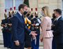 Что касается наряда жены французского президента Брижит Макрон, то она выбрала для встречи темно-синее платье от любимого ею Louis Vuitton, украшенное узнаваемой монограммой бренда.