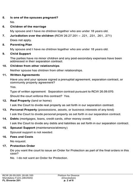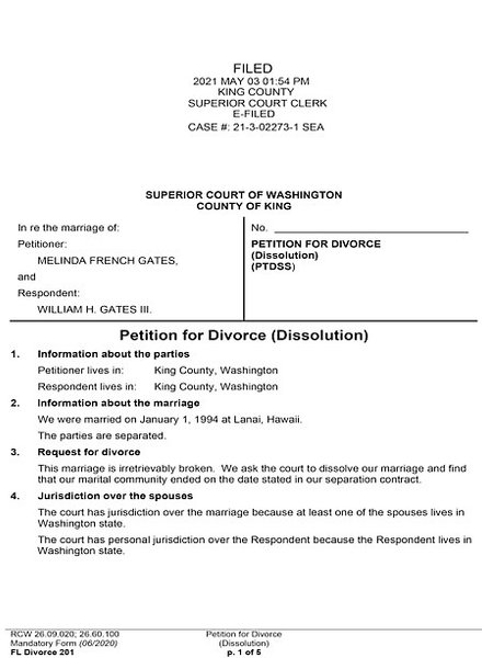 В ходатайстве о разводе, которое было подано в Верховный суд Вашингтона – округ Кинг, миссис Гейтс просила судью расторгнуть брак "в дату, указанную в нашем договоре о раздельном проживании". Контракт о раздельном проживании не был включен в подачу, поэтому дата не ясна.