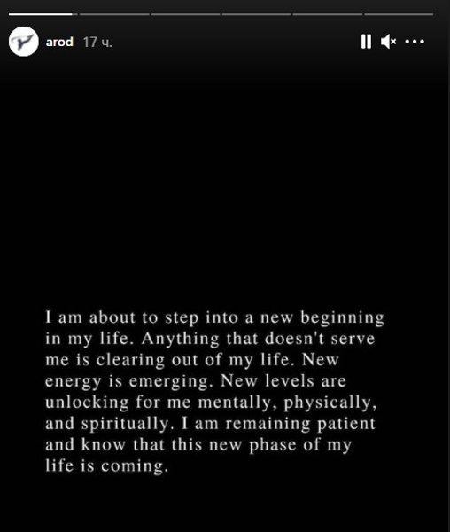 "Я готовлюсь к новому началу в своей жизни. Все, что мне не помогает, исчезает из моей жизни. Возникает новая энергия. Новые уровни открываются для меня умственно, физически и духовно. Я остаюсь терпеливым и знаю, что приближается этот новый этап в моей жизни".