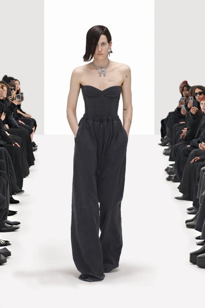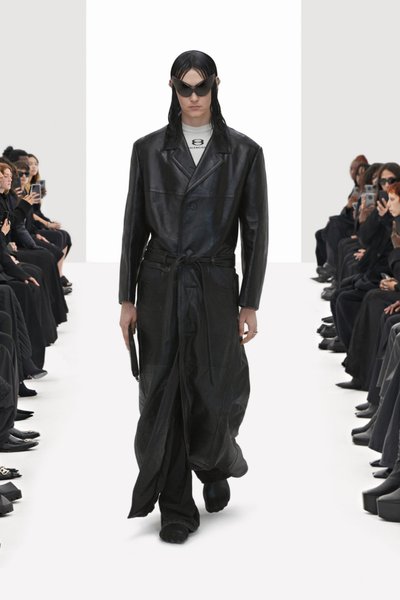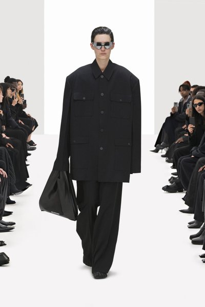 "В сети мы видим не то, что есть на самом деле. Что настоящее, а что подделка?", – говорит он. По его словам, все 44 образа представляет одна модель – художница Элиза Дуглас, открывающая и закрывающие показы Balenciaga еще 2016 года, когда Гвасалия стал его креативным директором. Причем она демонстрирует как женскую, так и мужскую одежду, идя по белому подиуму, вдоль которого сидит публика в черном.