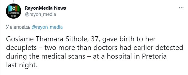 37-летняя Госиаме Тамара Ситхоле из Гаутенга (ЮАР) побила мировой рекорд Халимы Сиссе (Мали), родившей в прошлом месяце 9 детей, и воспроизвела на свет 10 малышей, пишет издание Pretoria News.