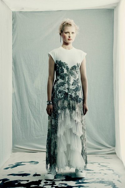 Признанный крой и точность Alexander McQueen проявляются в отделке корсета, а также в использовании тонкой вышивки на шелке, асимметричных разрезах и контрастных сочетаниях тканей.
