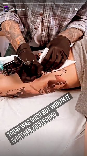 Последнее тату, океанскую волну, Адаму набил татуировщик Натан Костечко. Гигантский боди-арт простирается от его лодыжки до верхней части бедра.