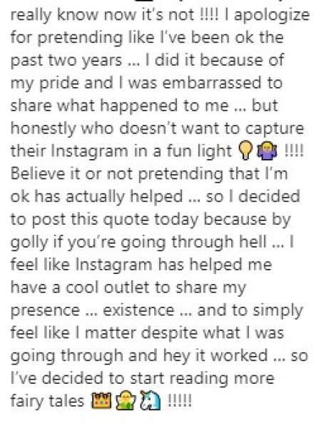 "Я верю, что все мы, как люди, хотим сказочной жизни, и, кстати, я написала… моя жизнь выглядит потрясающе… Я думаю, это то, к чему мы все стремимся! Я прошу прощения за то, что притворялась, будто я была в порядке последние два года… Я сделала это из-за своей гордости, и мне было неловко рассказывать о том, что со мной произошло… Но, честно говоря, кто не хочет снимать свой Instagram в веселом свете?", – пишет артистка.