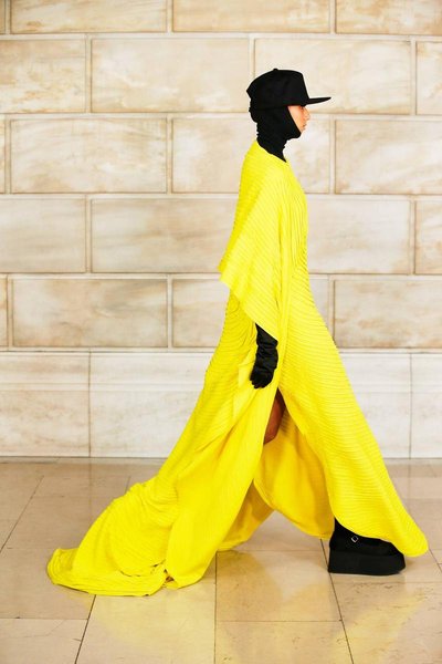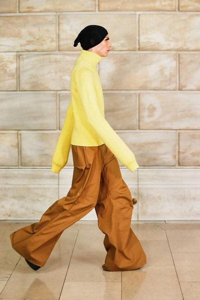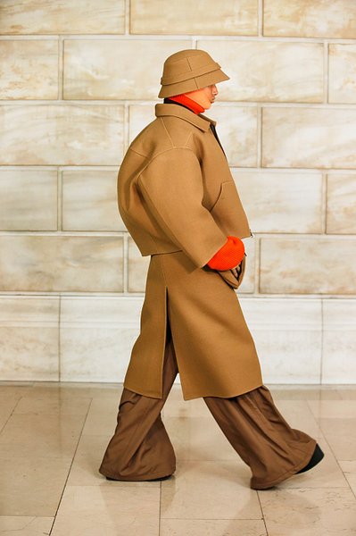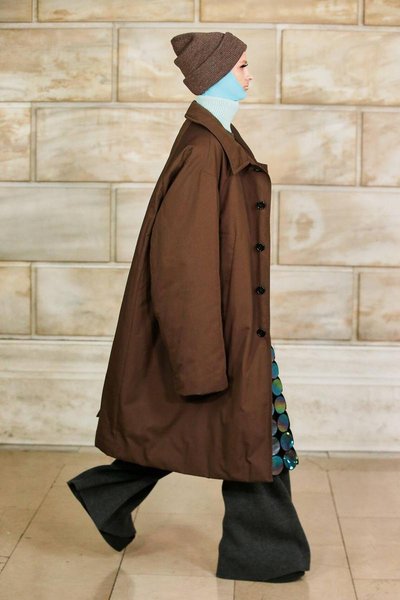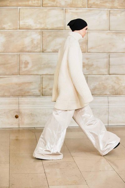 На показе, проходившем в Нью-Йоркской публичной библиотеке, модели дефилировали в нарядах, которые не имели совершенно ничего общего с минималистичной коллекцией дизайнера сезона осень-зима 2020. Гиперобъемные пуховики, многослойные total-look, кричащие монограммы, невероятных размеров капюшоны-коконы, юбки-миди и платья-кольчуги из крупных перламутровых дисков с широкими штанами для дополнительного объема, трикотажные костюмы-двойки, которые всем так полюбились во время самоизоляции, платья-пуховики в викторианском стиле и огромные шарфы и горжетки из искусственного меха – вещи, которые не могут не обратить на себя внимание.