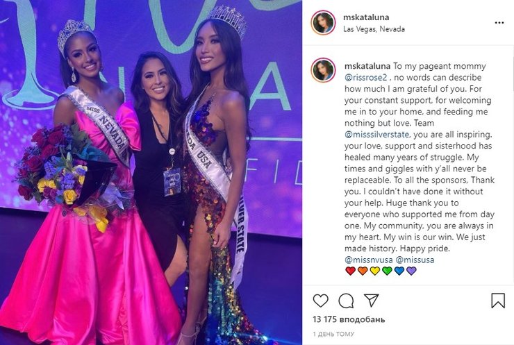 27-летняя Каталуна Энрикес американско-филиппинского происхождения выиграла конкурс красоты "Мисс Невада США" и станет первой трансгендерной женщиной, которая примет участие в конкурсе "Мисс США", сообщает NBS News.