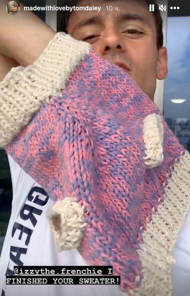 Позже сам Том в сториз Instagram объяснил, что вязал свитер для французского бульдога своих друзей по кличке Иззи, и показал готовое изделие.