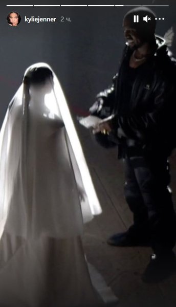 О шоу в соцсетях рассказали сестры Ким Хлои Кардашьян и Кайли Дженнер, опубликовав в сториз кадры, где теледива в белом наряде идет к рэперу.