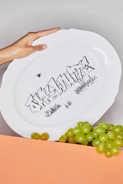 Американский модельер и дизайнер одежды, занимающий должность художественного руководителя мужской одежды бренда Louis Vuitton, а также основатель бренда Off-White Вирджил Абло решил попробовать свои силы не только в создании одежды класса люкс, но и в предметном дизайне. На своей странице в Instagram он представил коллекцию абсолютно белой посуды, украшенной граффити.