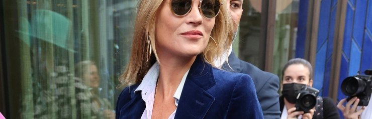 Кейт Мосс продемонстрировала простой и элегантный образ. Она надела джинсы-клеш с простой белой рубашкой, бархатным пиджаком и коричневыми ботинками на устойчивом каблуке. А дополнила образ солнечными очками и небольшим клатчем.