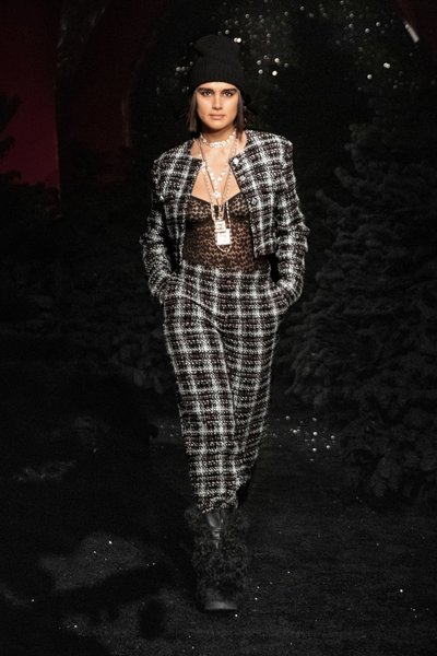 В этом сезоне французский бренд немного отошел от традиций и в некоторых моделях заменил традиционные юбки широкими брюками, добавив шляпы, цепочки и укоротив классические жакеты, добавив образу гранжа.