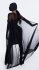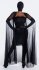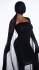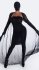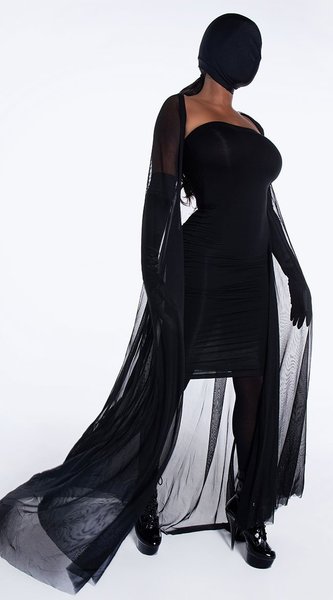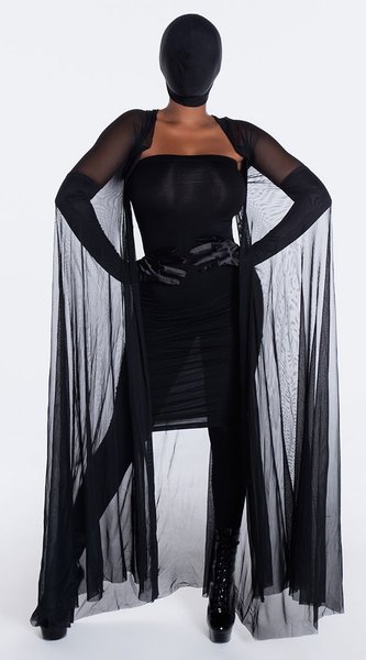 Ансамбль состоит из черной полупрозрачной накидки, облегающей полупрозрачной юбки, боди, темных колгот и длинных перчаток. На голове, как и полагается, воздухопроницаемый чулок.