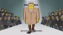 Демна привнес в мультфильм и изрядную долю сарказма. Эпизод высмеивал огромные подплечники дома (Мардж застряла в дверном проеме в платье своей мечты) и стоимость (Гомер чуть не упал в обморок, когда увидел ценник платья за $19 тыс). Гомер пристрастился к улиткам в чесночном масле и стал носить свисающую сережку и накидывать на плечи свою куртку в стиле Puffa, в которой очень напоминал Канье Уэста.