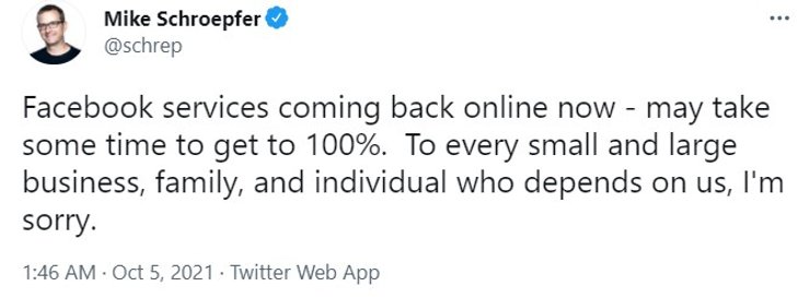"Сервисы Facebook возвращаются в сеть сейчас — может потребоваться некоторое время, чтобы достичь 100%. Приношу свои извинения каждому малому и большому бизнесу, семье и отдельному человеку, который зависит от нас".