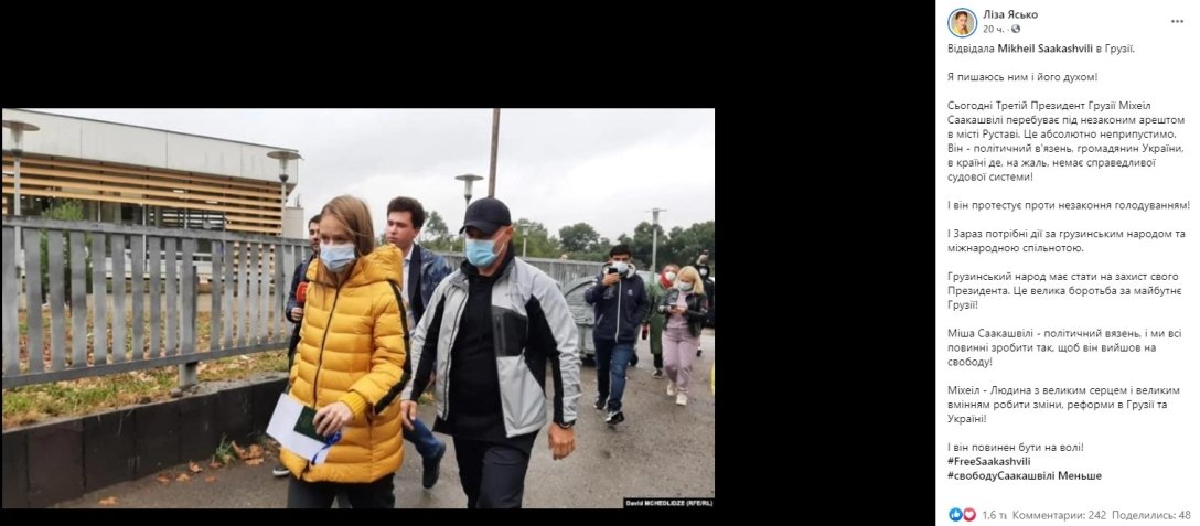 Когда стало известно о задержании Саакашвили, который попал в Грузию, воспользовавшись паспортом жены, украинский народный депутат Ясько 5 октября отправилась в Рустави, чтобы поддержать его. Ее заметили у здания городской тюрьмы, где сейчас находится экс-глава государства. Позже в соцсети Лиза Ясько сообщила о том, что гордится третьим президентом Грузии, который "незаконно арестован", и его духом.