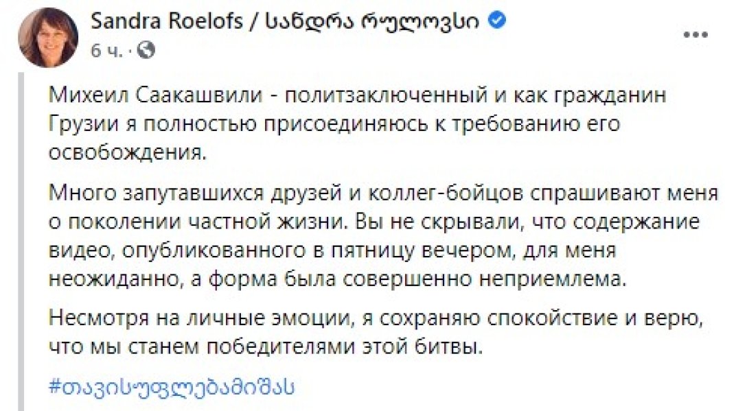 "Много растерянных друзей и товарищей спрашивают меня о личной жизни. Я не скрываю, что содержание видео, опубликованного в пятницу вечером, для меня неожиданно, а форма совершенно неприемлема. Несмотря на личные эмоции, я сохраняю спокойствие и верю, что мы станем победителями этой битвы", – написала Сандра Рулофс, добавив, что ее супруг – политзаключенный, и она, как гражданка Грузии, присоединяется к требованиям его освобождения.