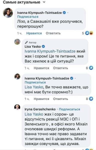 "Похоже, что Михаил Саакашвили не предупредил жену, что решил жениться во второй раз, однако Сандра Рулофс продолжает вести себя как леди", — пишет грузинская пресса. Всячески поддержали супругу Саакашвили и в комментариях в соцсетях. А вот Лизе Ясько довелось прочитать в свой адрес не очень-то нелестные отзывы. Так, нардеп от "Европейской солидарности" Иванна Климпуш-Цицнадзе поинтересовалась у Ясько, развелся ли Саакашвили. В ответ та возмутилась, что подобные вопросы интересуют кого-то в сложившейся ситуации.