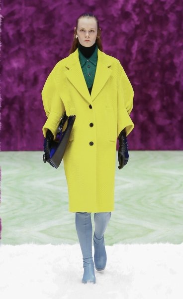 Яркий цвет пальто не только выделит из толпы, но и поднимет настроение в серый пасмурный осенний день. Главные оттенки сезона – лимонный, оранжевый, красный, синий и зеленый. Такие цвета хорошо комбинируются с однотонными аксессуарами и обувью, становясь доминирующими в образе. В своих коллекциях разнообразные модели ярких пальто представили Prada, Balmain и другие дома моды.