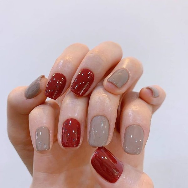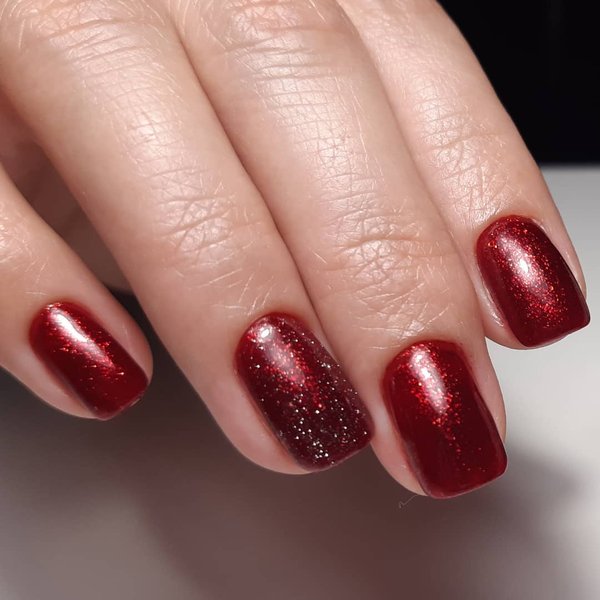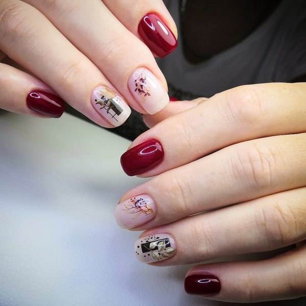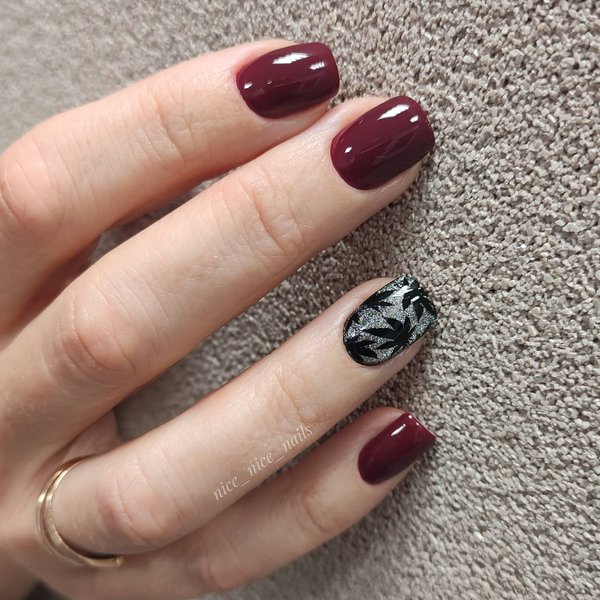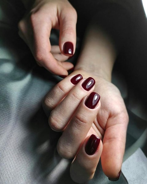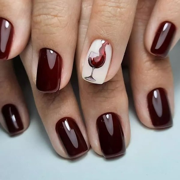 Винный, темно-красный и рубиновый цвета смотрятся не только эффектно на коротких ногтях, но и делают маникюр благородным и аристократичным. Матовый, с блеском и блестками, с контрастным цветом на 1-2 ногтях, минималистичным рисунком и ненавязчивым декором такой маникюр станет роскошным дополнением любого образа.