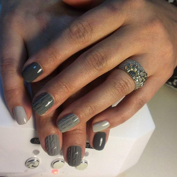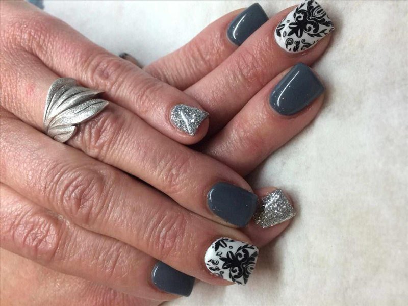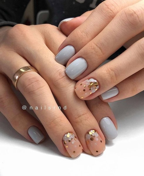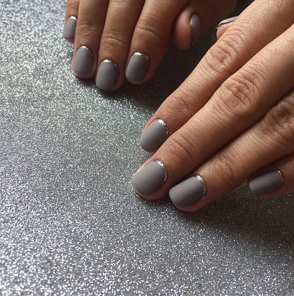Серый (от светлого до темного) маникюр в течение нескольких сезонов не теряет своей популярности. Несмотря на свою неоднозначность, он хорошо подходит для коротких ногтей, причем как блестящий, так и матовый. Он ненавязчивый, легко сочетается с другими цветами и декором. Поэтому тонкий контрастный рисунок, полоски фольги френч и обратный френч или небольшой кристалл будут отличным решением для завершения такого маникюра.
