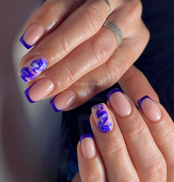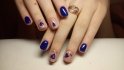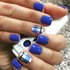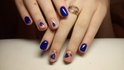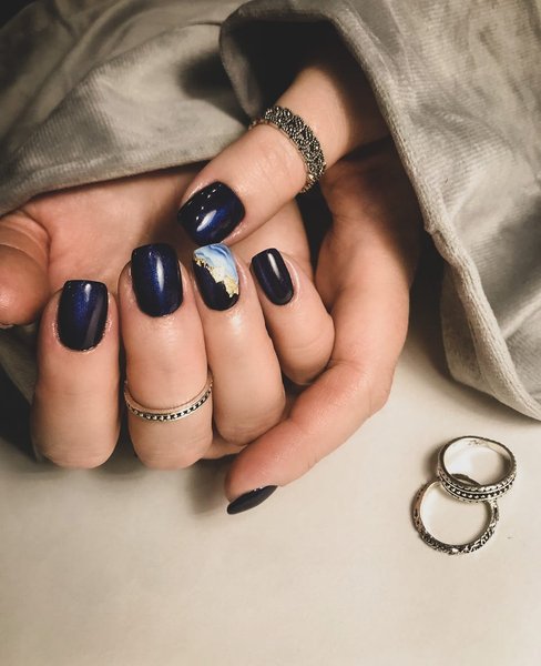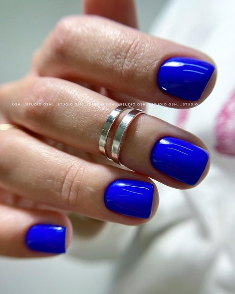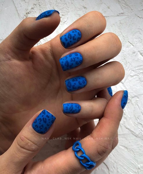 Синий маникюр, начиная от светлого и заканчивая цветом ночного неба, выглядит на коротких ногтях по-особенному благородно. Как и в случае с изумрудным цветом, эффектно смотрится маникюр "кошачий глаз", придавая ногтям дополнительное сияние. В этом сезоне очень моден леопардовый принт, и синий маникюр с таким рисунком смотрится особенно актуально. Для создания более праздничного варианта синего маникюра приветствуются маленькие блестки или стразы, контрастный рисунок, фольга.