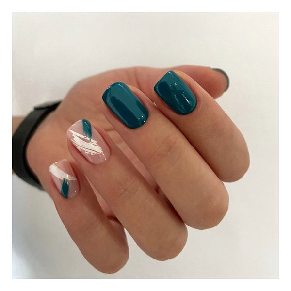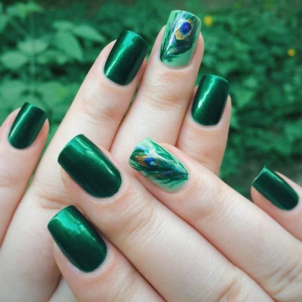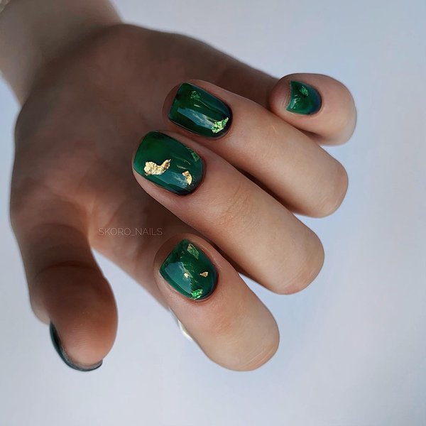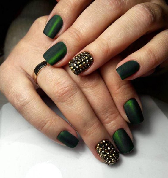 Темно-зеленый маникюр смотрится очень благородно на коротких ногтях. Он имеет множество оттенков, каждый из которых по-своему интересен. Изумительно выглядит на ногтях как однотонное покрытие, так и маникюр "кошачий глаз", а также использование разных типов лака (матовый и глянцевый) на разных ногтях, декор одного-двух ногтей блестками для праздничного маникюра, использование разных оттенков одного цвета, фольги, сочетание контрастных цветов и тому подобное.