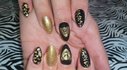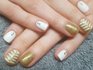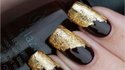 Несмотря на то, что золотой маникюр сам по себе смотрится богато и самодостаточно, эффект будет совсем идеальным при комбинировании золотого лака с черным, белым, красным и нюдовыми тонами. Это могут быть полосы, френч, обратный френч, эффект битого стекла, рисунки золотом или же декор блестками и стразами золотого цвета или фольгой. Не менее нежно смотрятся золотые рисунки на нюдовом покрытии, придавая маникюру некую легкость и нежность.