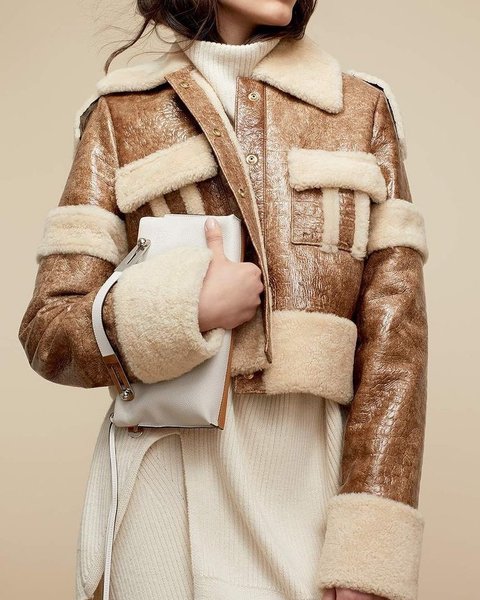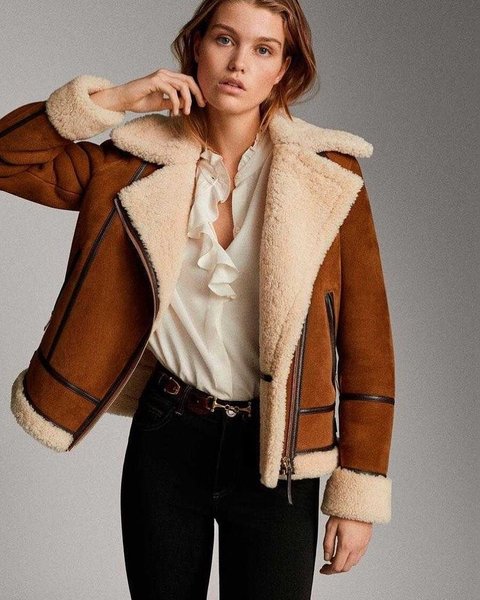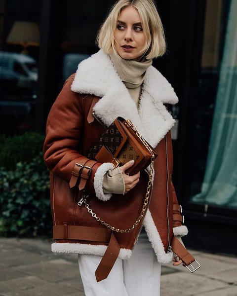 Светлая дубленка-авиатор освежит зимний образ и сделает его более женственным, а также хорошо будет гармонировать не только с повседневной одеждой, но, например, и с брючным костюмом.