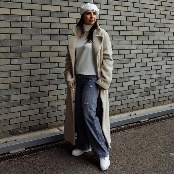 Дубленки оверсайз отлично смотрятся в паре с грубыми ботинками на толстой подошве. Чтобы сбалансировать образ, стоит надеть светлые брюки или джинсы, а шарф и шапку подобрать гладкие по фактуре.
