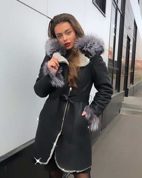 По мнению стилистов, хитом сезона является двубортная темно-серая дубленка с английским воротником и подкладкой в тон
