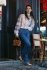 На снимке она позирует в желтой блузе, фиолетовых шортах, коричневом жакете, накинутым на плечи, и в туфлях с массивным каблуком на высокой платформе. Образ дополняет сумочка бренда.