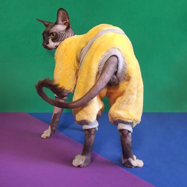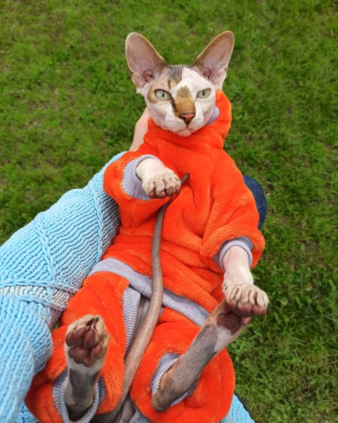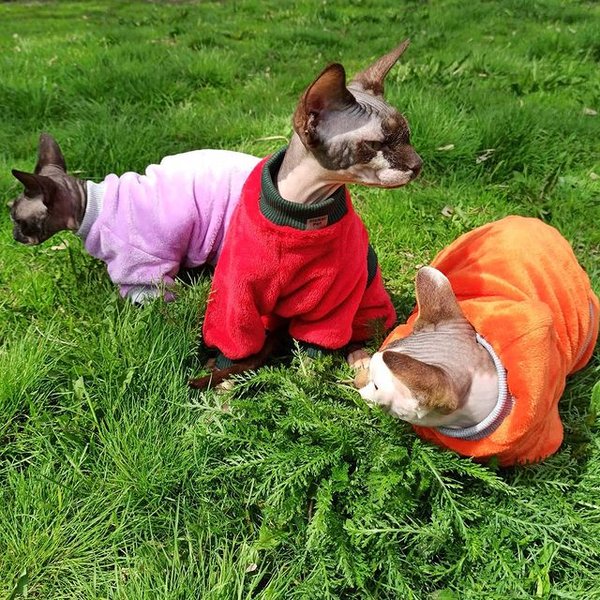 Чтобы согреть сфинкса, необходимо позаботиться об одежде для него. Отлично подойдут изделия из мягкой ткани. Однако стоит помнить, что сфинксы потеют, и одежда впитывает этот кожный жир, поэтому ее нужно стирать довольно часто, чтобы она не стала шероховатой.