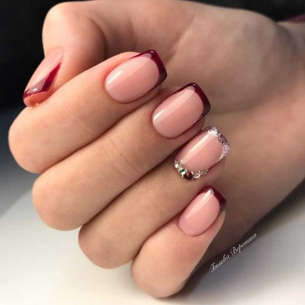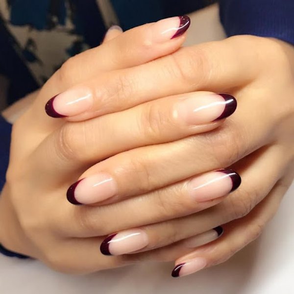 Нюдовый лак вкупе с бордовым френчем – изюминка сезона, которая одновременно сочетает в себе классику и новизну. Причем френч может быть как классический, так и обратный, то есть ко внутренней кромке ногтя.