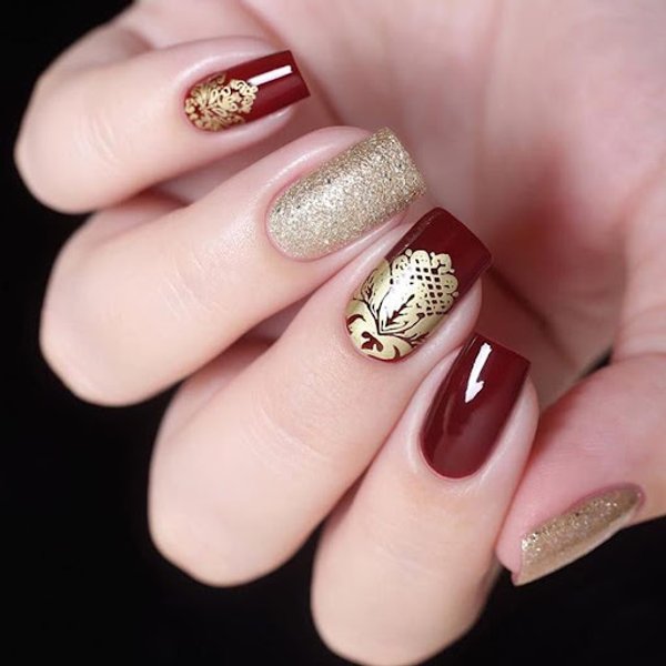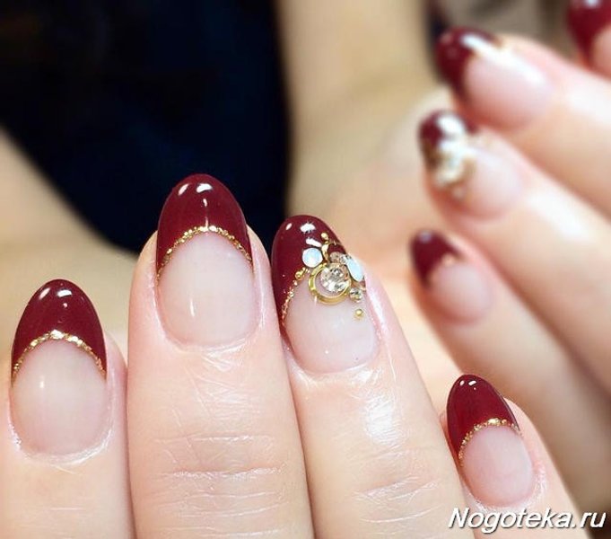 Винный насыщенный цвет ногтей как нельзя лучше гармонирует с цветом золота. Поэтому мастера ногтевой эстетики в этом сезоне советуют смешивать эти два цвета, чтобы получить максимально впечатляющий эффект. Френч с золотом, декор фольгой, золотые рисунки на бордовых ногтях, золотой глиттер на одном-двух ногтях, покрытых темно-бордовым лаком смотрятся очень дорого и элегантно.