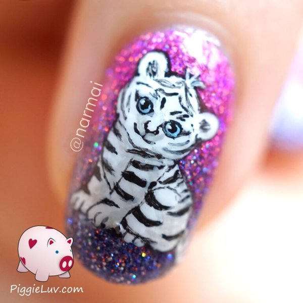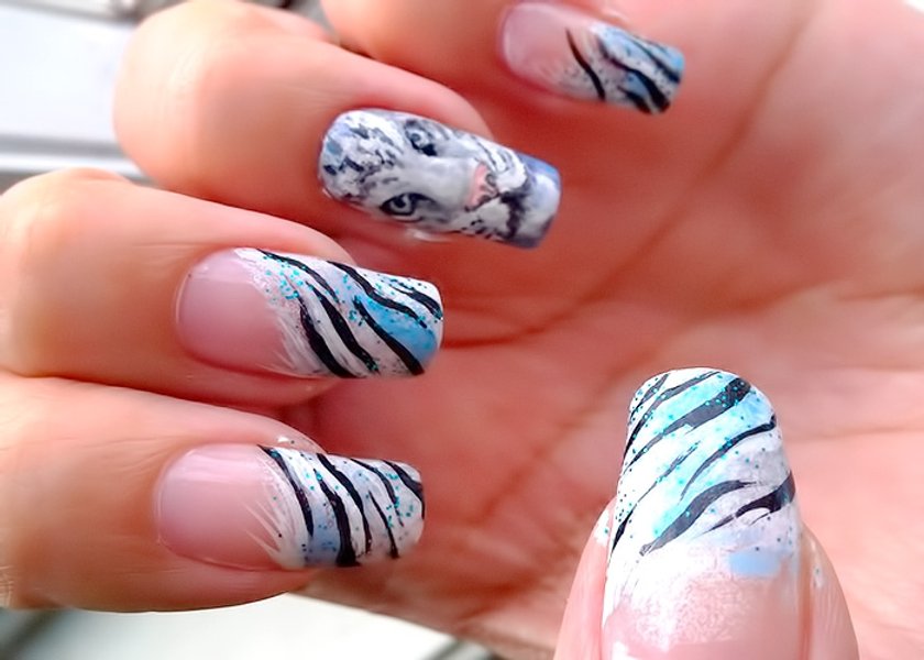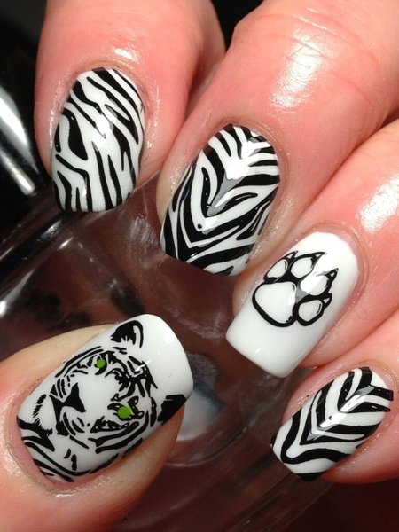 Зачастую при создании тигрового маникюра мастера рисуют не только расцветку животного на ногтях, но и его морду. Она может быть нарисована как частично, так и полностью. В некоторых случаях на ногти наносят тигровый узор в комбинации с леопардовым.