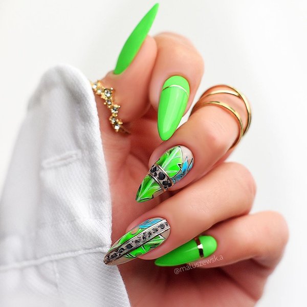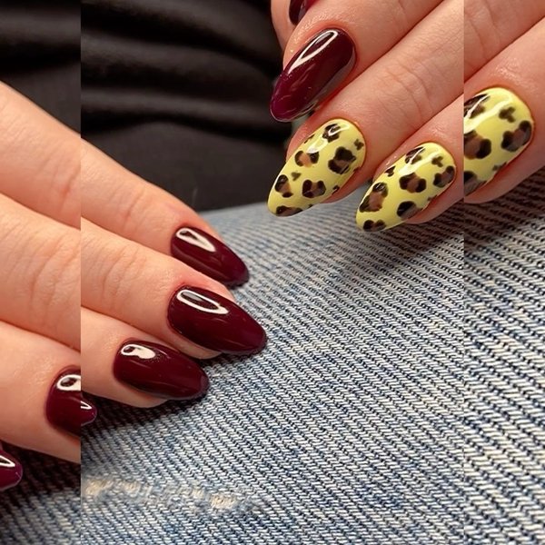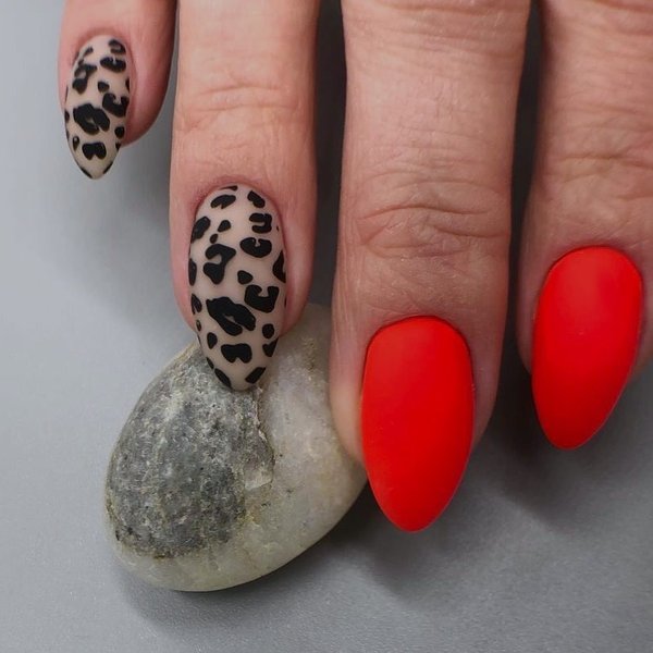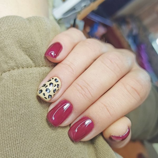 В качестве базы под леопардовый принт можно брать не только нюдовые или нейтральные цвета, но и более смелые варианты. Например, он очень эффектно смотрится на красном, бордовом, изумрудном маникюре, а также на неоновых оттенках.