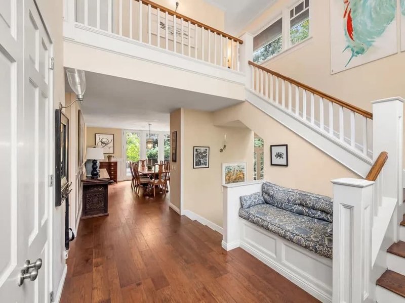 Район зонирован для конного спорта, извилистым живописным ручьем и несколькими пешеходными мостиками, тропами для верховой езды и пеших прогулок. В доме с пятью спальнями и шестью ванными площадью 390 кв. м светлые комнаты с большими окнами и мансардными окнами, три камина, просторная кухня и смежная семейная комната. Также на территории есть сауна, спа, бассейн в виде грота и освещенный теннисный корт в окружении старинных дубов, платанов и эвкалиптов.
