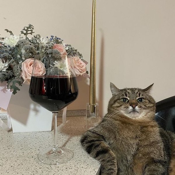 Певица опубликовала снимок, на котором Степан вальяжно возлегает у стола, облокотившись на его край лапой, а рядом стоит большой бокал вина. При этом выражение лица у кота – абсолютно равнодушное.