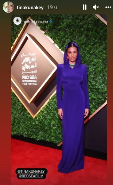 Модель сопровождала супруга на премьере фильма "Сирано". Для выхода на красную дорожку она надела синее платье в восточном стиле с капюшоном, которое подчеркивало ее формы и стройную талию. Свой образ она дополнила изумрудным ожерельем и такими же кольцами. В руках девушка держала маленькую стеганую сумочку золотистого цвета. Волосы модели были зачесаны обратно в элегантный пучок, что открывало ее от природы красивые черты лица.