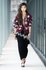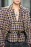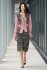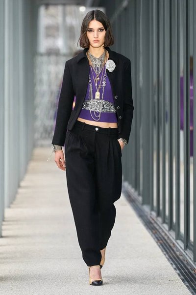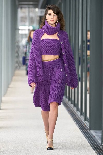 Органическую решетчатую структуру фасада можно было увидеть в твидовых карманах, украшавших тонкое пальто-столбик, открывшее представление, а также на тунике. Более образно эта идея была предложена в трехмерном вязании пурпурного ансамбля с укороченным топом и кюлотами или в вышивке верхней части топа золотыми лентами ручной пряжи.