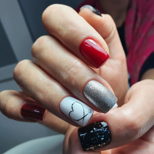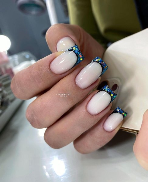 В канун новогодних праздников на квадратных ногтях идеально будет смотреться маникюр с глиттером, причем как френч, так и акцентный маникюр с покрытием глиттером одного-двух ногтей или же полным покрытием, чтобы сделать ногти сверкающими и заметными в общем новогоднем образе.