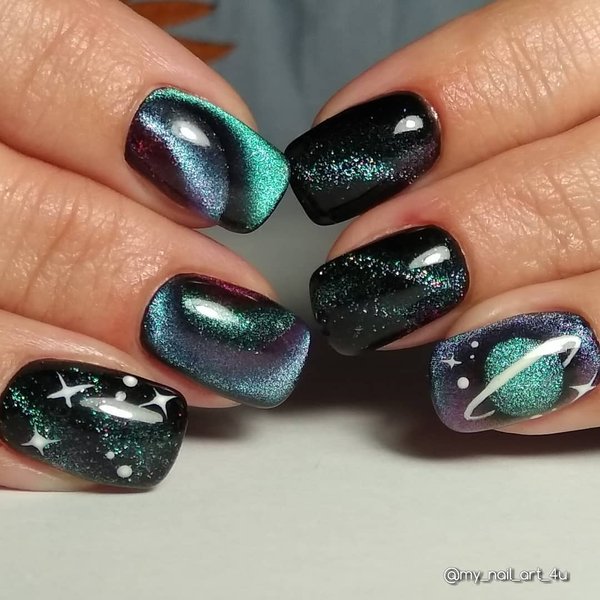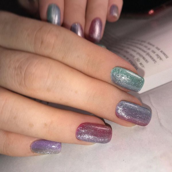 Вместе с квадратными ногтями в моду вернулся и градиентный маникюр. Его можно сделать как в пастельных, так и в самые ярких цветах. Кроме того, на квадратных ногтях эффектно смотрится маникюр, выполненный в технике "кошачий глаз".