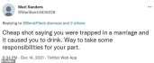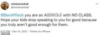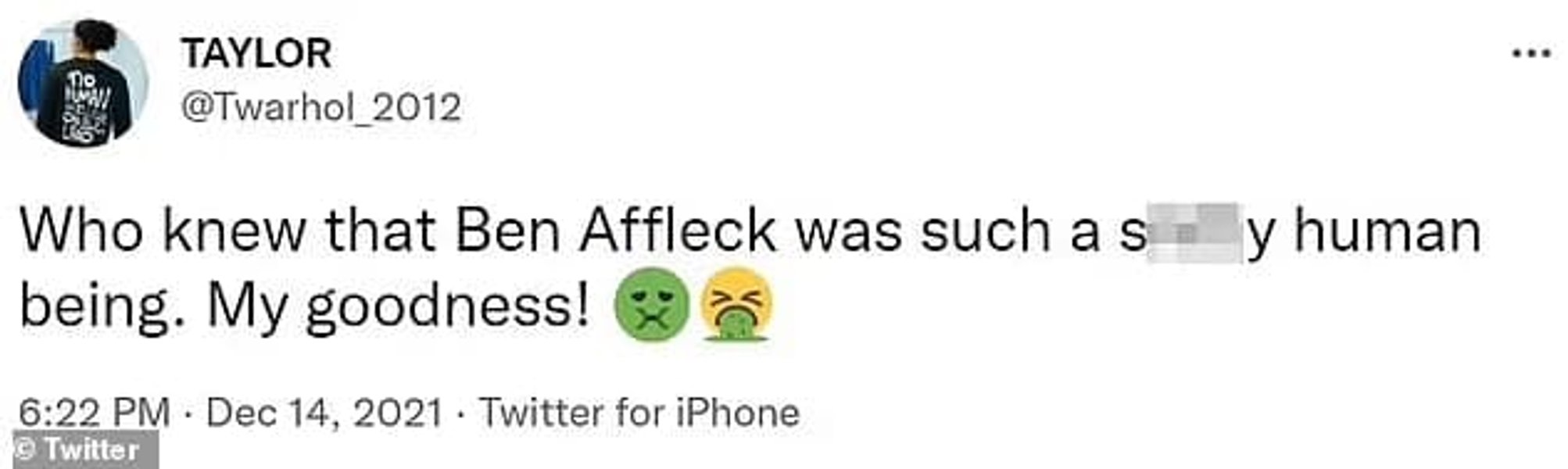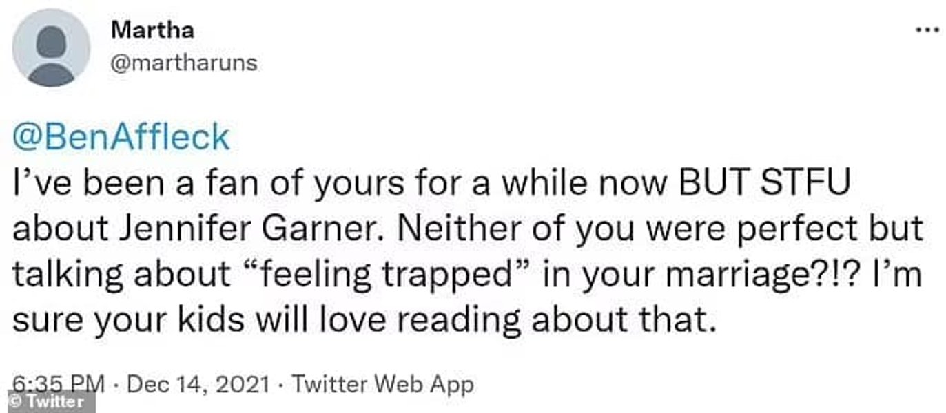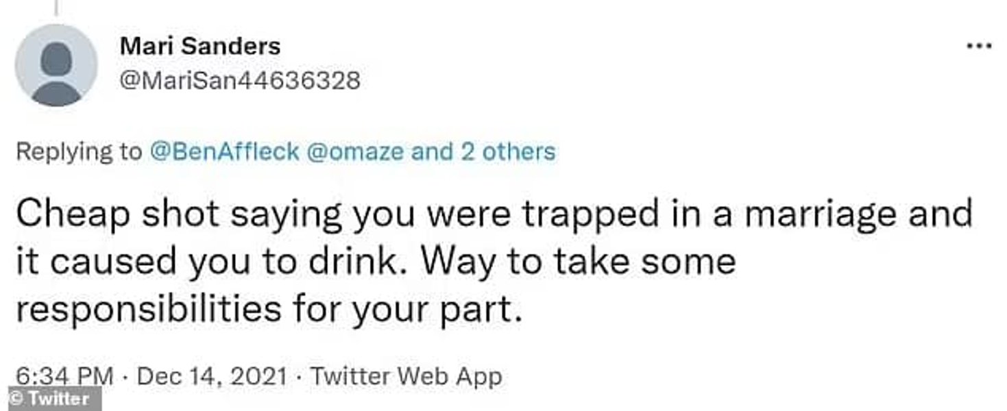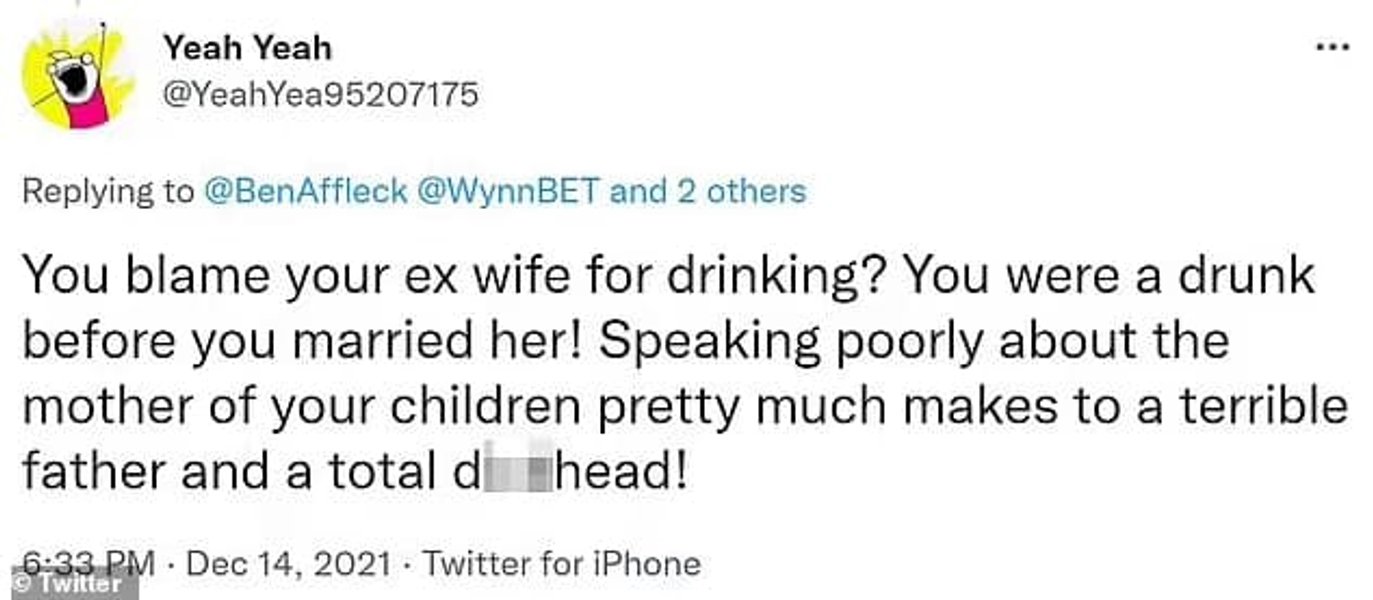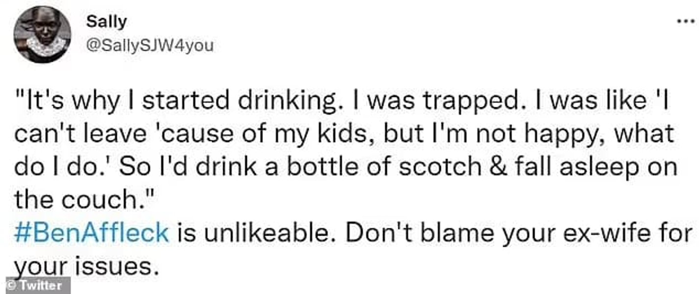 "Ты обвиняешь свою бывшую жену в пьянстве? Ты был пьяным до того, как женился на ней!", "@BenAffleck звучит так, будто вы обвиняете свою бывшую жену в том, что вы пьете! Отморозок!", "Ты чертова голова. Даже если это касается несчастья в вашем браке, зачем вам публично втаптывать бывшую в грязь и, по-видимому, винить эту ситуацию в своем саморазрушительном выборе", "Как он мог все еще чувствовать себя в ловушке после развода, если Дженнифер Гарнер отвезла его в реабилитационный центр? @BenAffleck ниже прудовой нечисти. Настоящее жалкое человеческое оправдание", – пишут в комментариях.