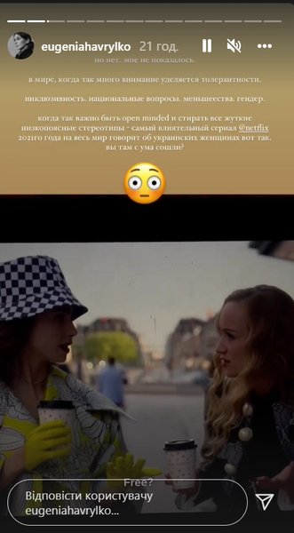 "Женя, спасибо за этот пост. Не смотрела 2й сезон, так как в 1 сезоне меня сильно выбесил этот весь флер — круасаны, американка в Париже, сосед красавчик, слишком cheesy. Но это прям сильно странно и тупо. И камон, не знаю ни одну украинку которую зовут Петра", – гласит один из комментариев.
