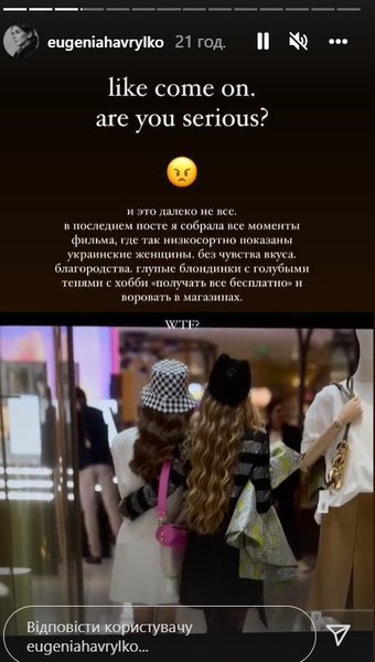 "Будучи самым успешным шоу @netflix в 2021 году, зная свое влияние на миллионы умов и сердец во всем мире, все еще есть место для такого невежества и нетерпимости? То, как вы отнеслись к образу украинцев во втором сезоне, в 4-й серии, – это такой дешевый трюк, абсолютный скандал и позор. И я не могу поверить, что это все еще будет происходить в 2021 году. Время, когда мы проявляем уважение ко всем нациям и гендерам. Время, когда мы боремся со всеми стереотипами, разрушающими мир и межкультурные отношения. Время, когда никто не смеется над такими убогими вещами. Несмотря на это, вы выставляете украинку как личность без чувства вкуса и достоинства. Глупая, невежественная воровка. Вы вообще серьезно?", – недоумевает автор.