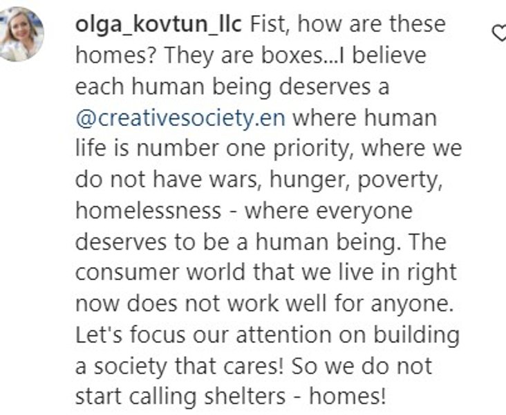 "Это ужасно. Увидеть, как относятся к ветеранам. Живут в коробках из-под обуви", "Рискните своей жизнью ради США, чтобы жить в собачьей будке после", "Я никогда не забуду этого парня, который сказал: "К черту свои свободы", когда они вводят драконовские законы для каждого среднего американца. С отвращением", "Как они относятся к твоей идее "к черту свою свободу"?", "Дома? Те, что на фото, выглядят как туалетные кабинки", "Разве это дома? Это коробки … Я считаю, что каждый человек заслуживает общества, где человеческая жизнь является приоритетом номер один, где у нас нет войн, голода, бедности, бездомности — где каждый заслуживает быть человеком. Мир потребителей, в котором мы сейчас живем, никому не подходит. Давайте сосредоточим наше внимание на построении общества, которому небезразлично! Так что не начинаем называть приюты – домами!", "Почему вы не можете сохранить это в секрете, вместо того чтобы разжигать собственное эго?", – пишут пользователи.