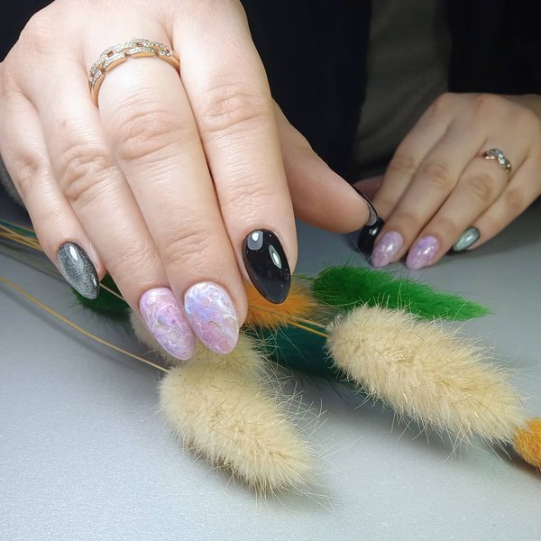 Несмотря на то, что этот маникюр сам по себе очень эффектный и не особо нуждается в дополнительном декоре. Некоторые мастера все же стараются сделать ногти еще красивее, пользуясь правом на пару ноготков для контраста. Они покрывают их лаком цвета, который либо сочетается с основным, но не имеет эффекта глубинного блеска, либо же используют стразы, блестки, фольгу, рисуют небольшие элементы в виде цветов, снежинок, сердечек, в зависимости от тематики и сезона.